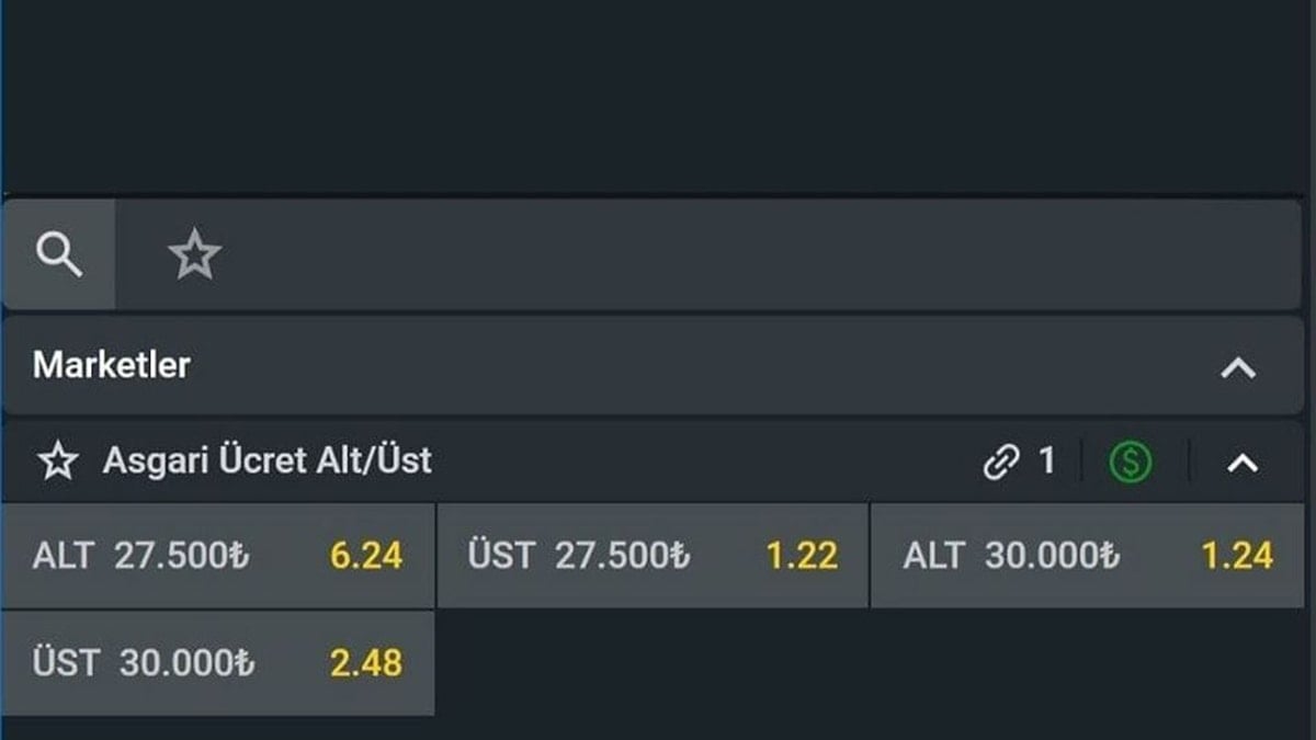 Yasa dışı bahis sitesi halen 22 bin 104 TL olan asgari ücretin 2026’da 27.500 ile 30.000 TL aralığında açıklanma şansını yüksek görerek oran verdi. Site, asgari ücretin 27 bin 500 TL’nin altında açıklanma ihtimaline 6.24, üstünde açıklanma ihtimaline ise 1.22 oran veriyor.