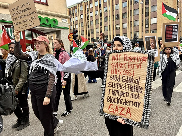 “Bu bir savaş değil, soykırım”, “Özgür Filistin”, “Katil İsrail”, “Direniş, özgürlük, adalet ve yeniden yapılanma” sloganları atan İsveçliler “Soykırımı durdurun” mesajı verdi.